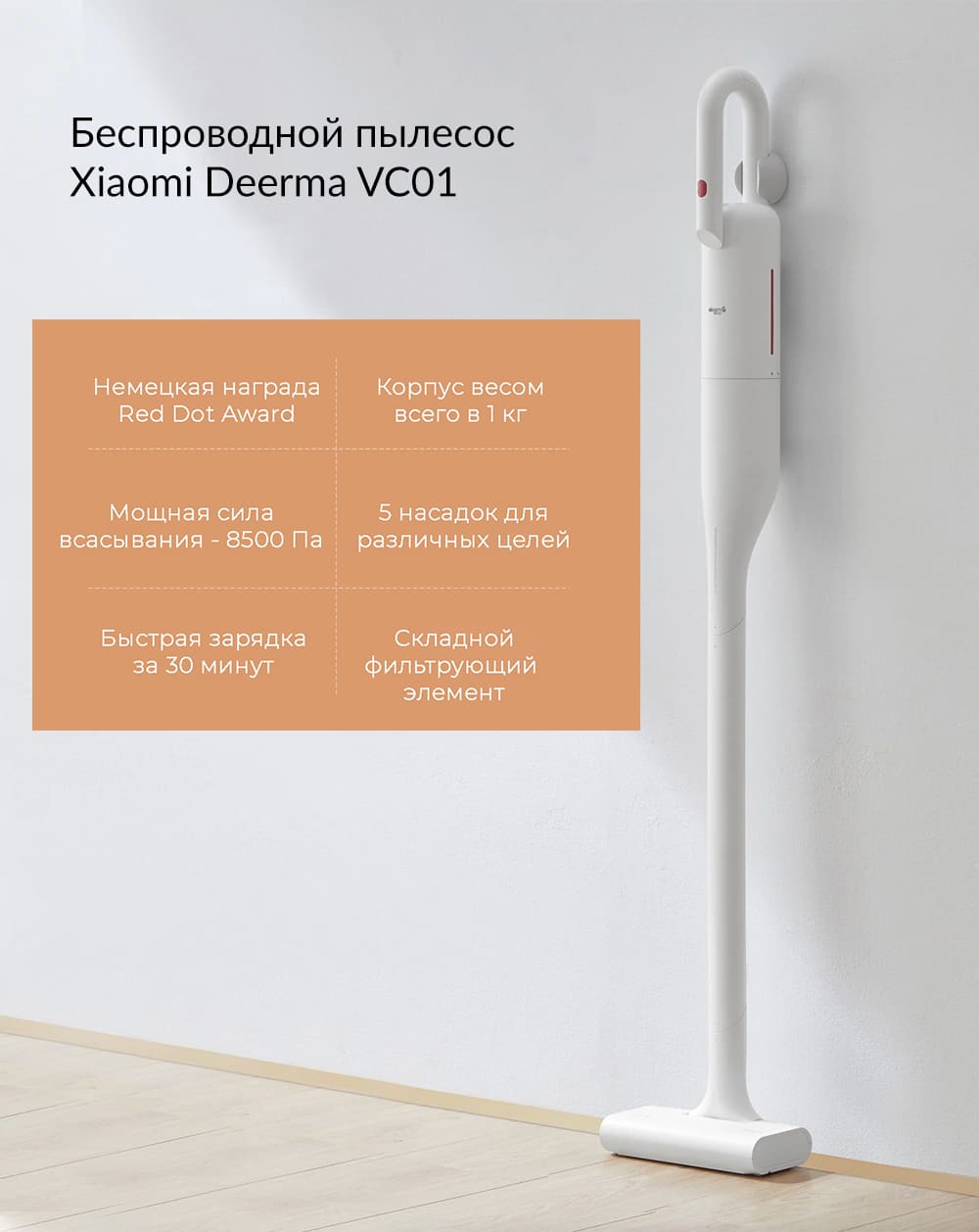 Самая полная уборка всего одной рукойИнженерам Deerma удалось создать пылесос с небывалым весом всего в 1 кг - как две бутылки воды по 500 мл. Он изменит Ваши представления об уборке, сделав ее такой же легкой и естественной, как обычную зарядку.